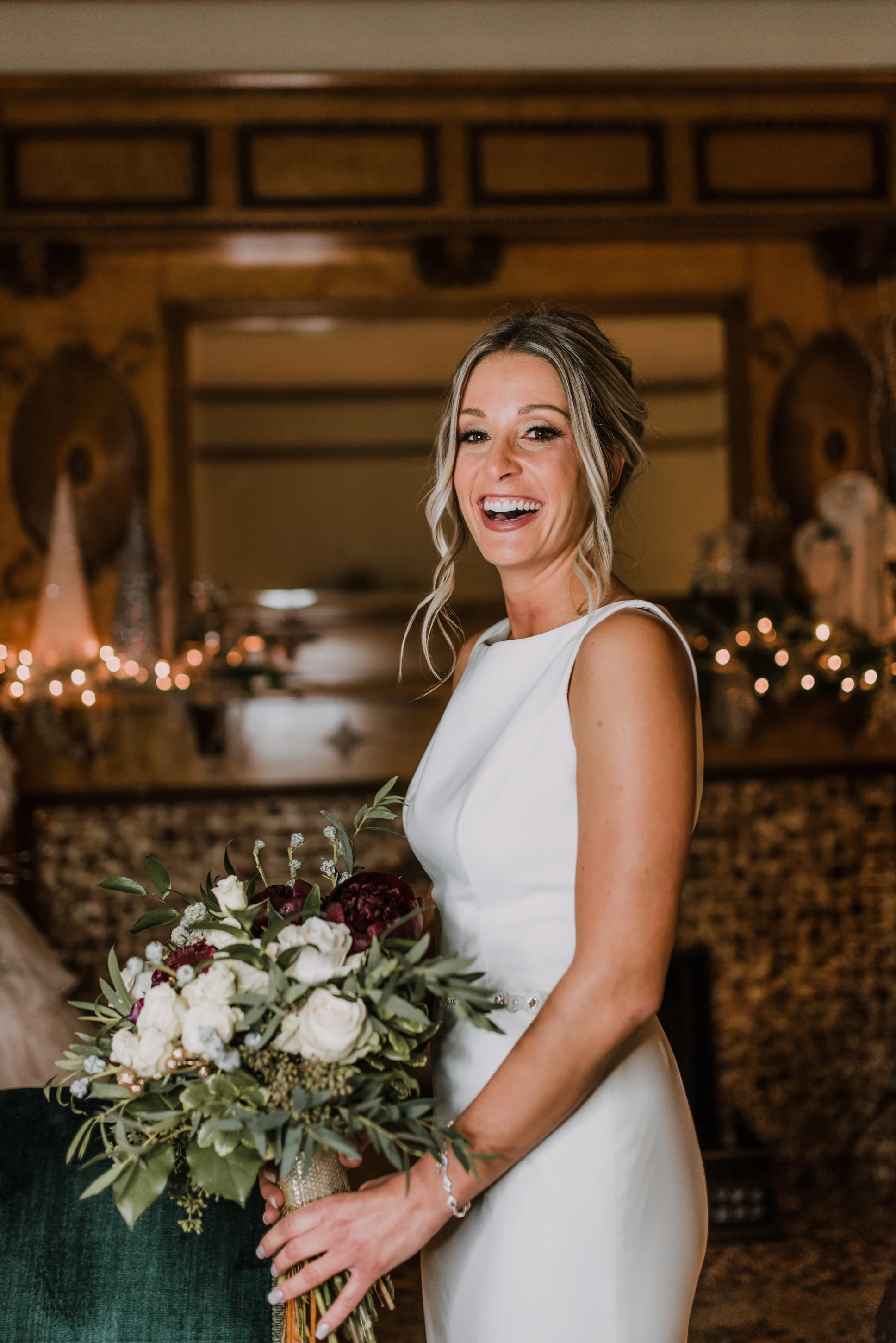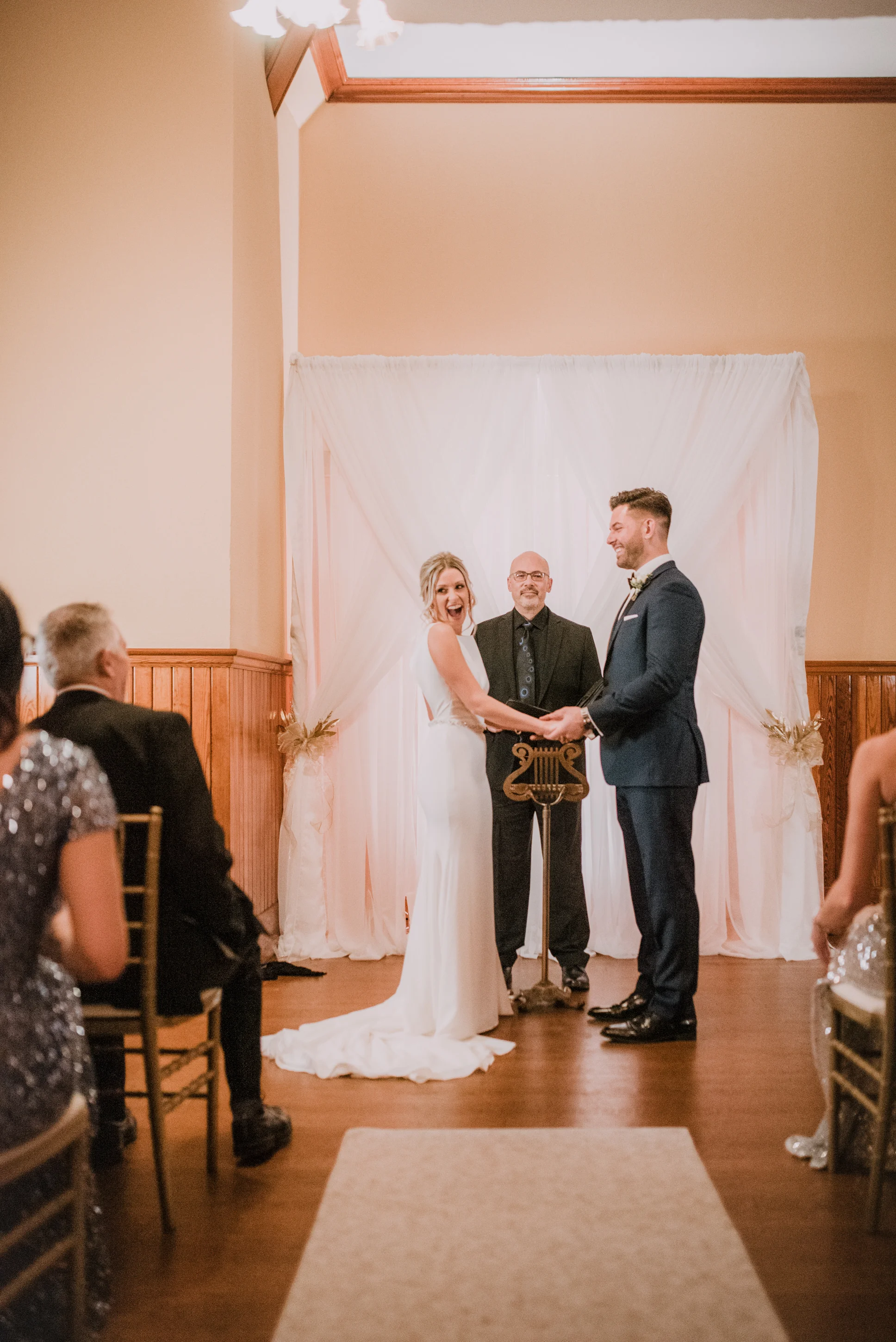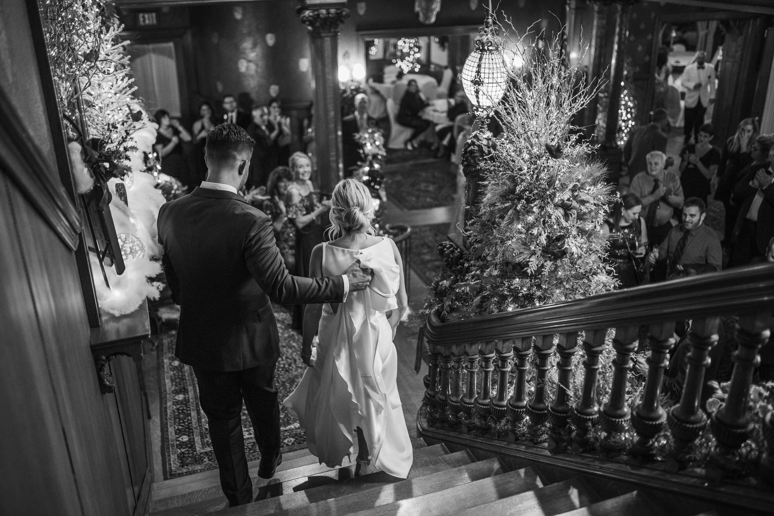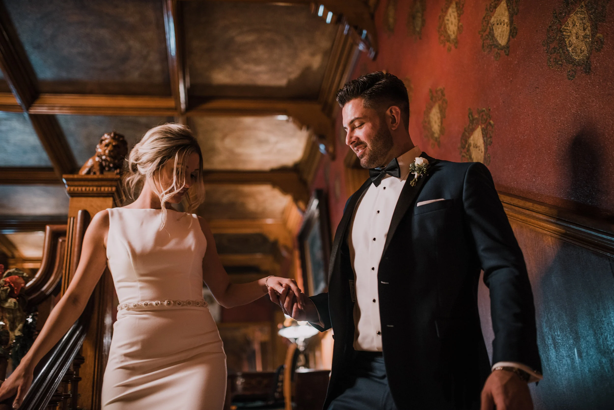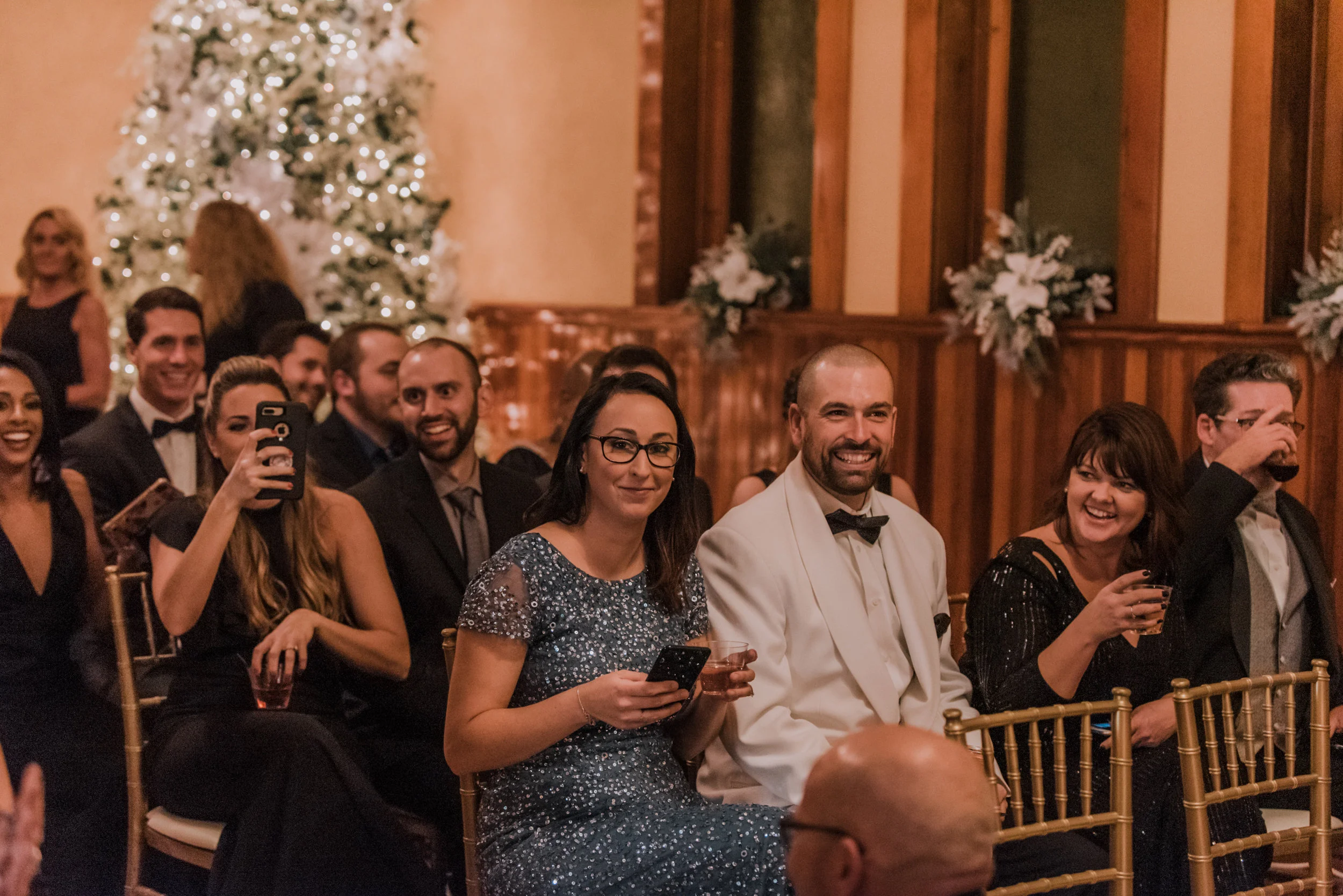 They invited all of their family and closest friends by pretending to have a black tie murder mystery dinner party. If I’m remembering the invite on our fridge, it said “come dressed to kill.” So we did! The murder mystery was an absolute blast. An acting troupe came in from Michigan and performed. Spoiler: Ella Vater (Danielle) was the killer! When she was found out, she was sent to jail upstairs (AKA a good excuse to get in her wedding dress!!!!)